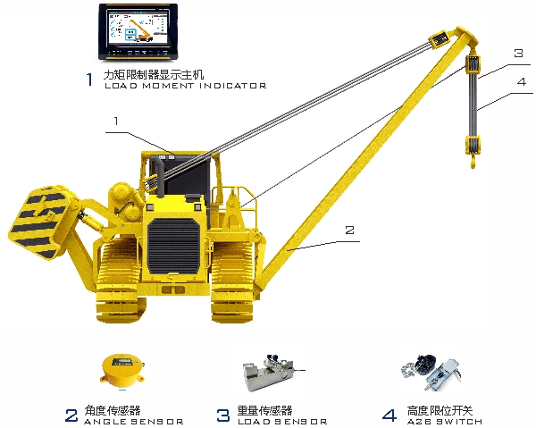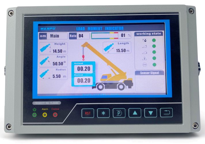 The WANPU Load Moment Indicator consists of a central microprocessor unit,display, pressure transducers,length/angle sensor, and anti-two block switches.The fixed data regarding the crane, such as capacity charts, boom weights, centers of gravity and dimensions are stored in memory chips in the central processor unit. This data is the reference information used to calculate the operating conditions. Boom length and boom angle are registered by the length/angle sensor, mounted inside the cable reel which is mounted on the boom.